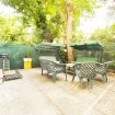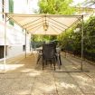 Un parte del giardino circostante è ad uso esclusivo: qui si trova un tavolo da pranzo, un dondolo a due posti e un posto auto.