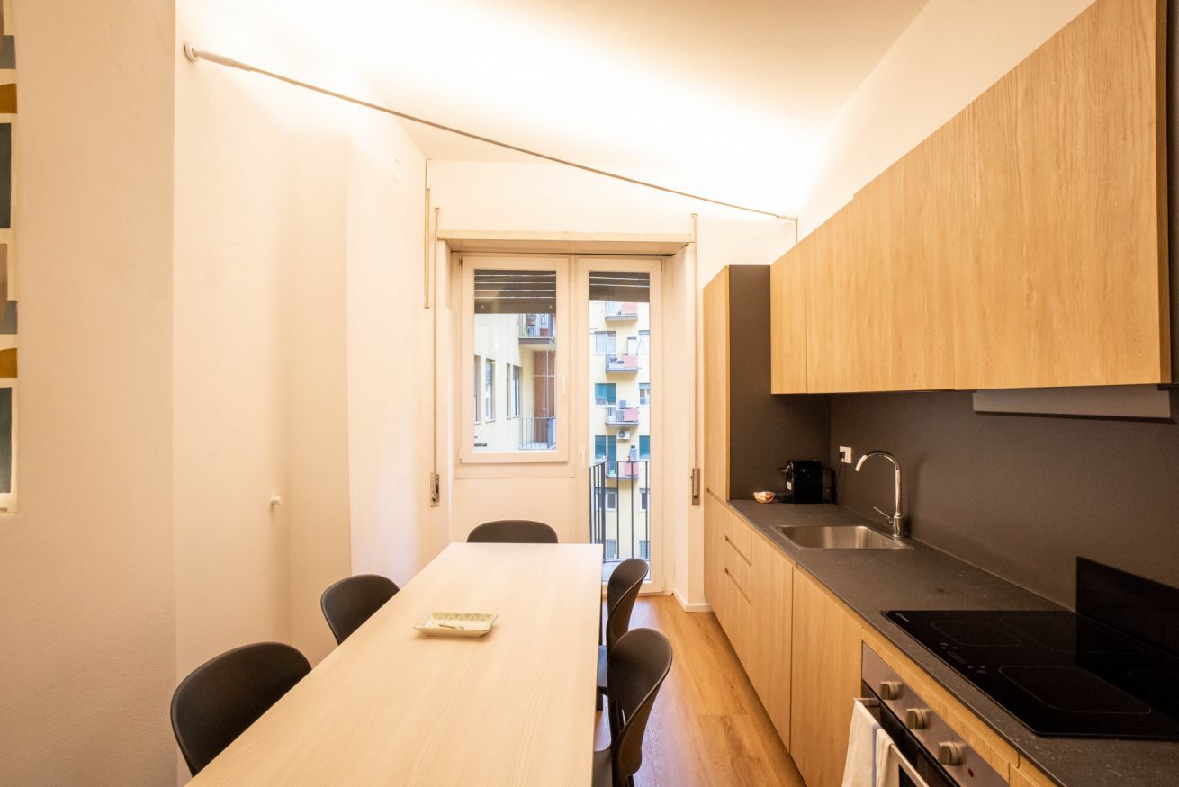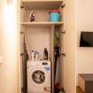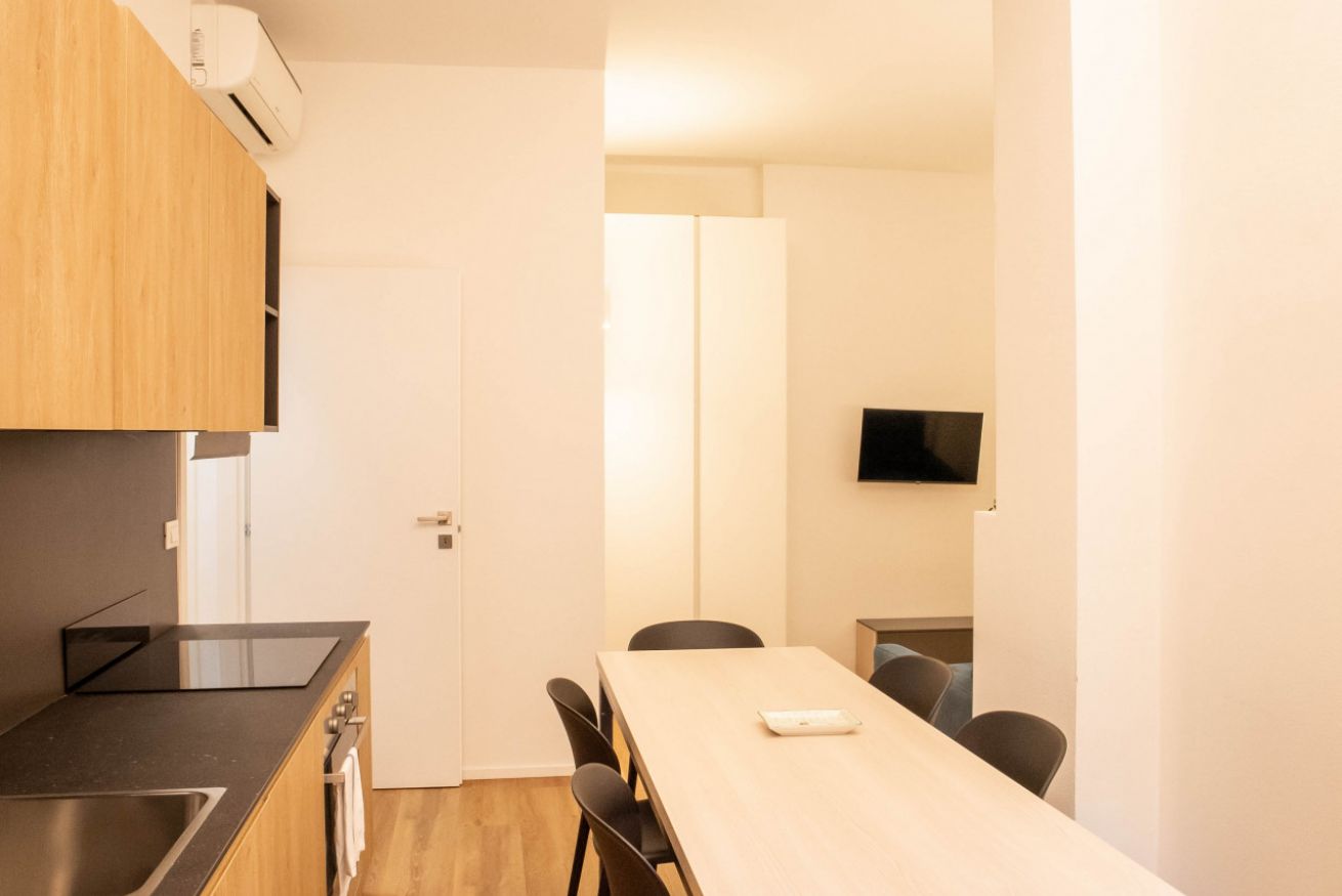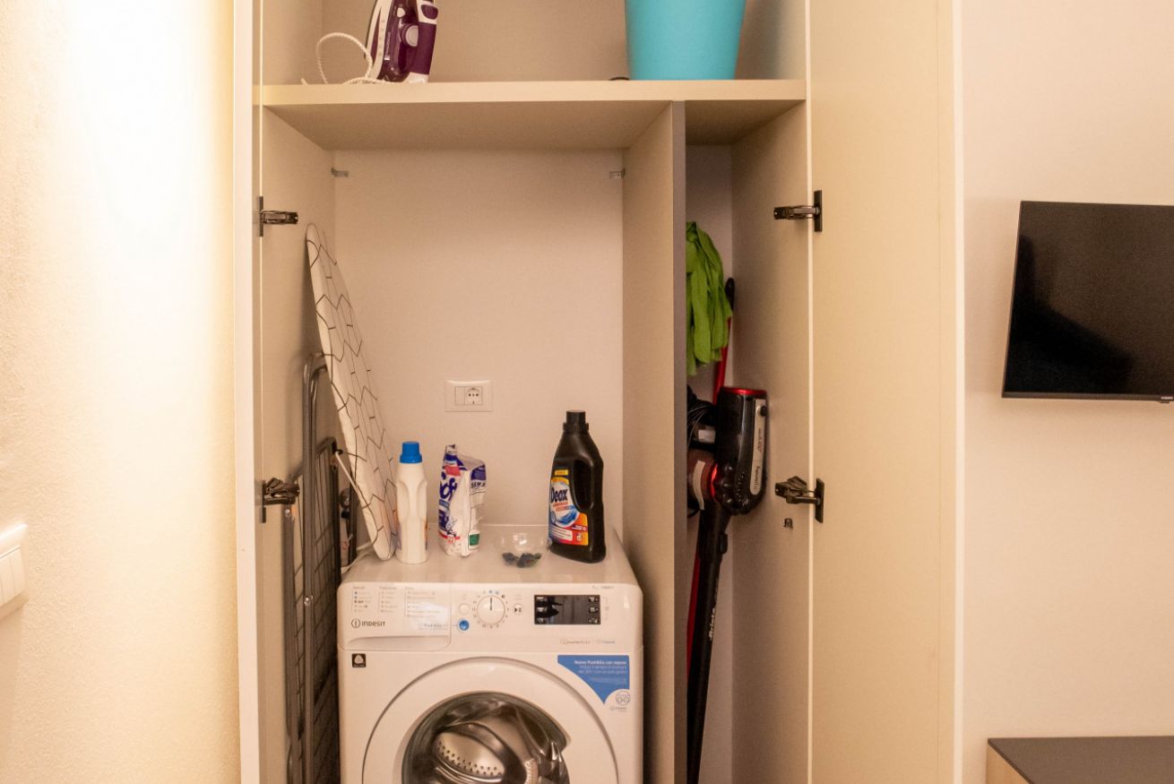 Apre su un ingresso da cui si accede alla sala da pranzo con cucina. La cucina è dotata di un ampio frigorifero, 4 fuochi ad induzione, forno e lavastoviglie. Qui è posizionato un tavolo da 7 sedute, un comodo divano letto a due piazze (materasso da 190x160 con spessore 18cm), una TV e un mobile lavanderia con lavatrice e spazio contenitivo per gli accessori di pulizia.