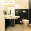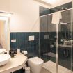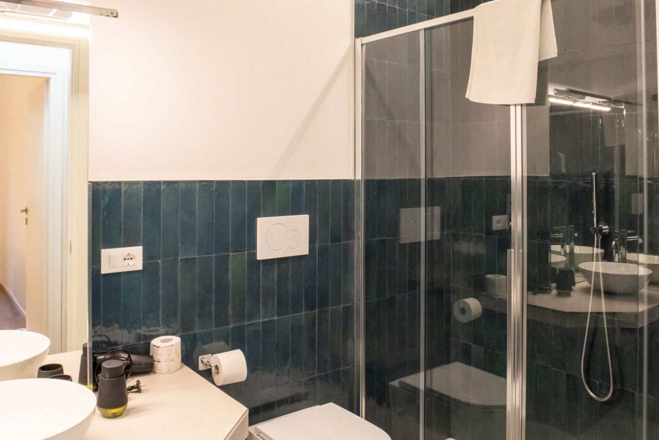 Il bagno di un lavandino a ciotola in appoggio su un piano in gres, una doccia spaziosa, wc e bidet.