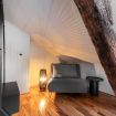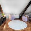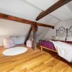 Continuando lungo la scala si accede alla seconda camera da letto mansardata: qui si trova un comodo letto matrimoniale, una poltrona letto (da 1 piazza - ha un materasso sottile, adatto ad un bambino, eventualmente per un adulto possiamo aggiungere un materassino per renderlo più confortevole) e due comodi pouff davanti a una televisione. Anche questa camera ha il proprio bagno completo di lavandino, doccia, WC e bidet