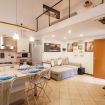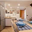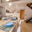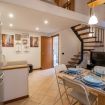 Al piano inferiore troviamo la cucina con un tavolo per 4 persone, un divano letto matrimoniale e la tv.