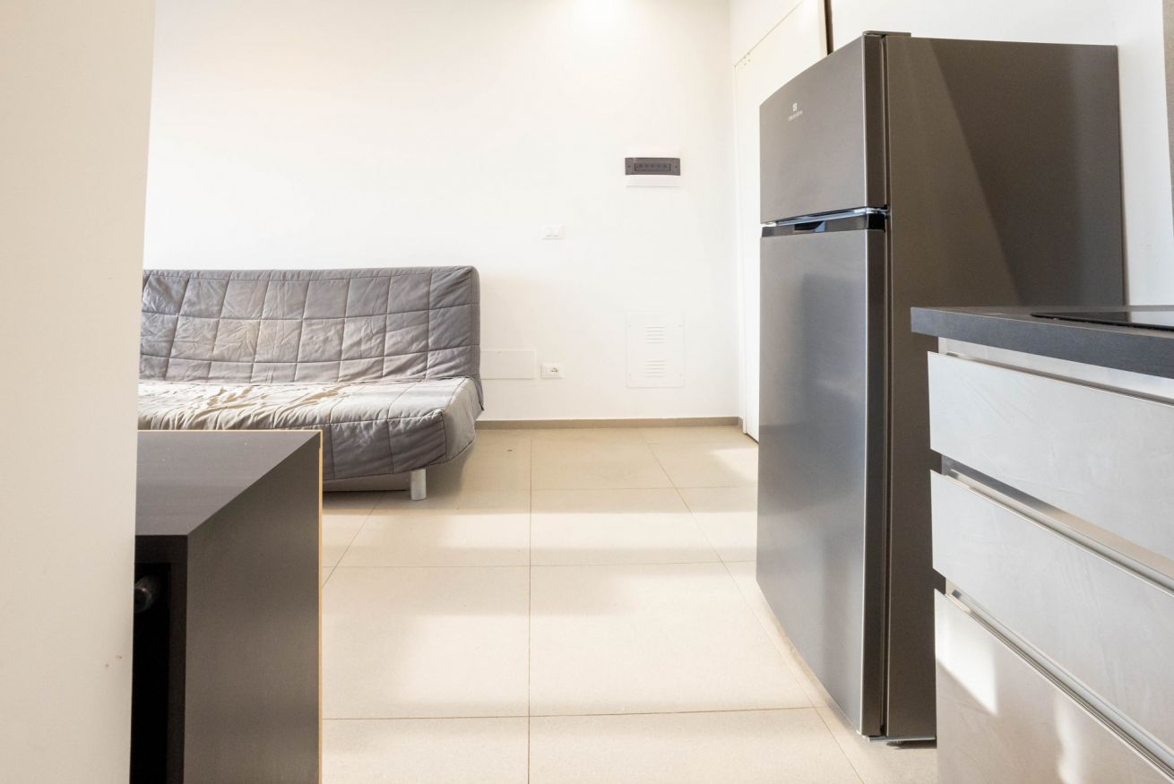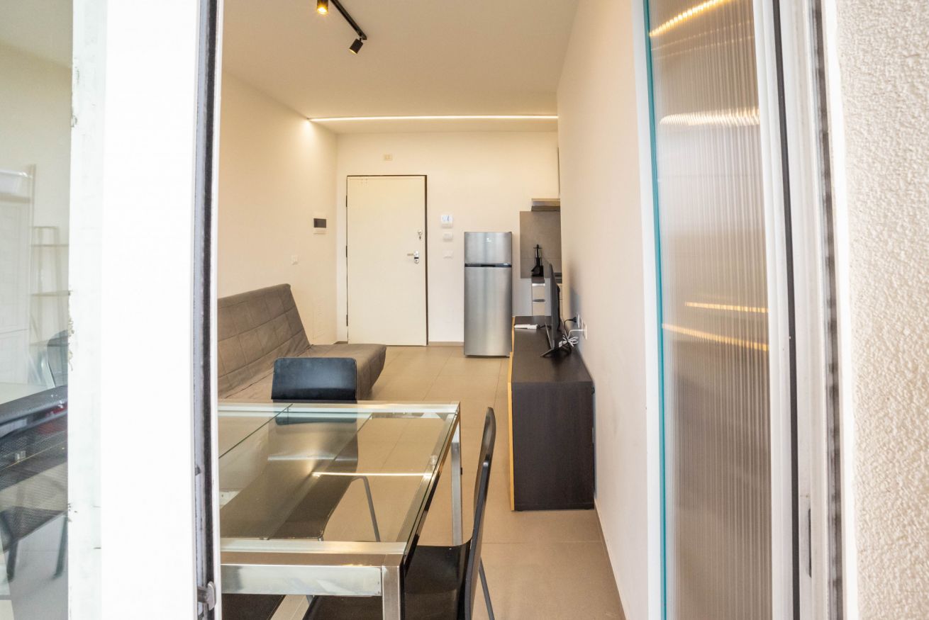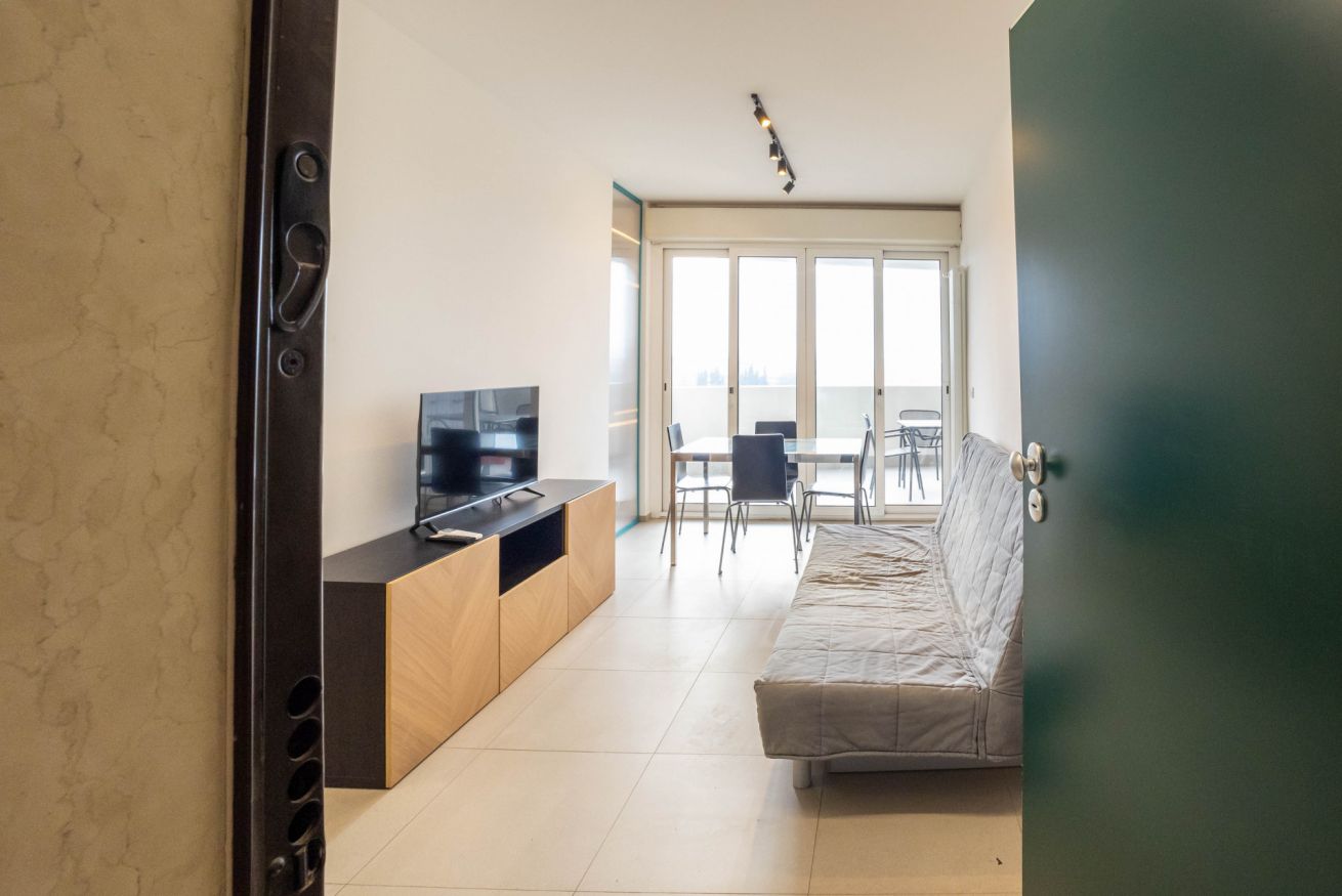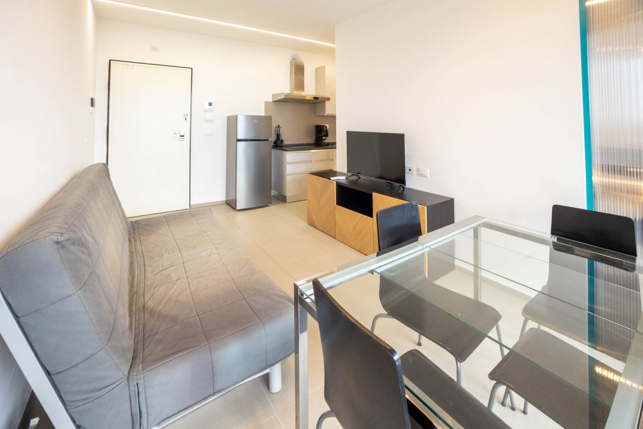 L’ingresso introduce in una zona giorno ampia e ben illuminata, composta da un soggiorno con divano letto, televisione, un tavolo da pranzo con 4 sedie. Dalla zona giorno si accede ad un terrazzino abitabile, dove è possibile rilassarsi e pranzare.