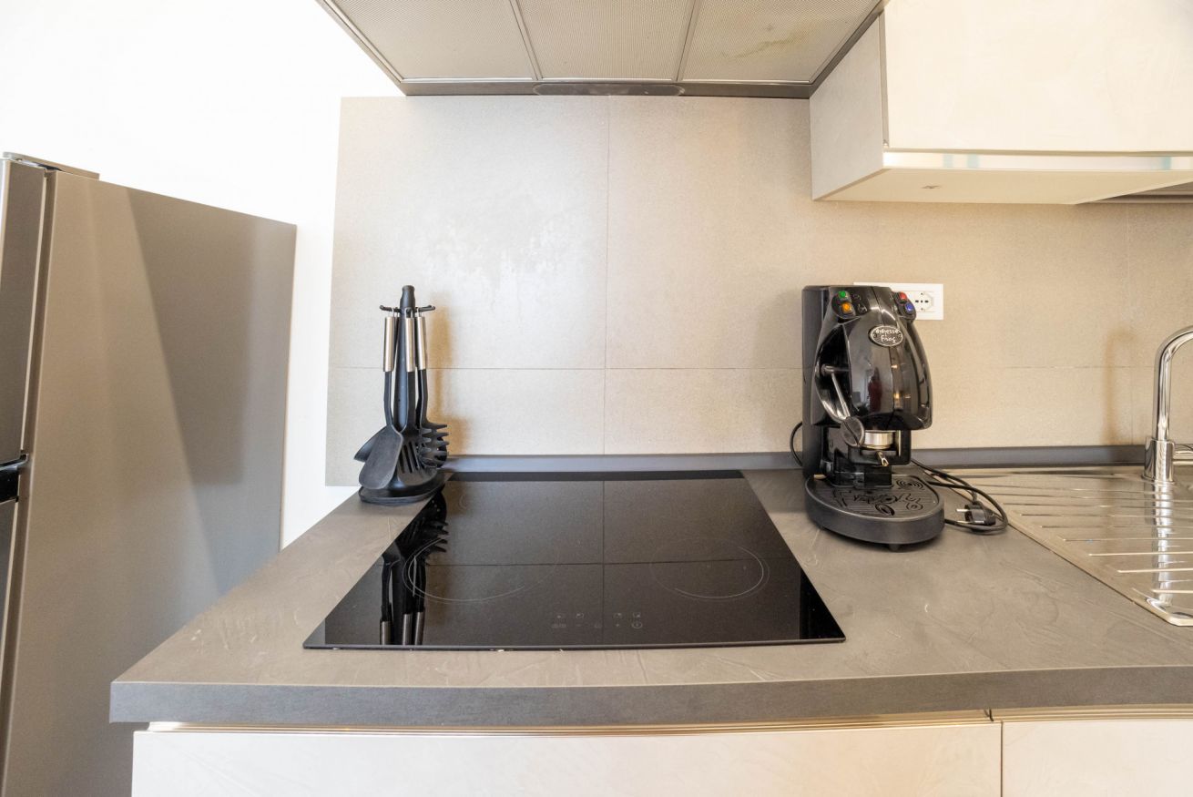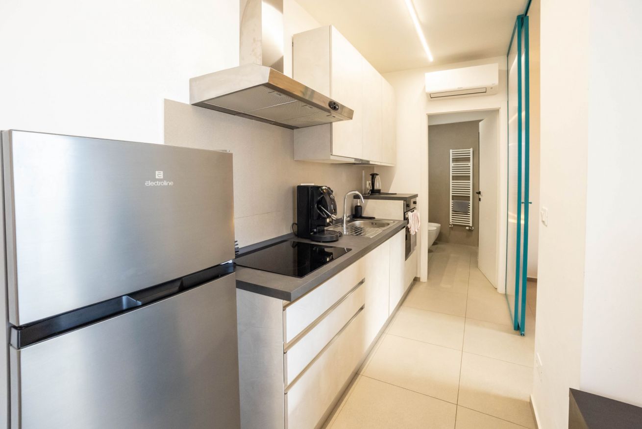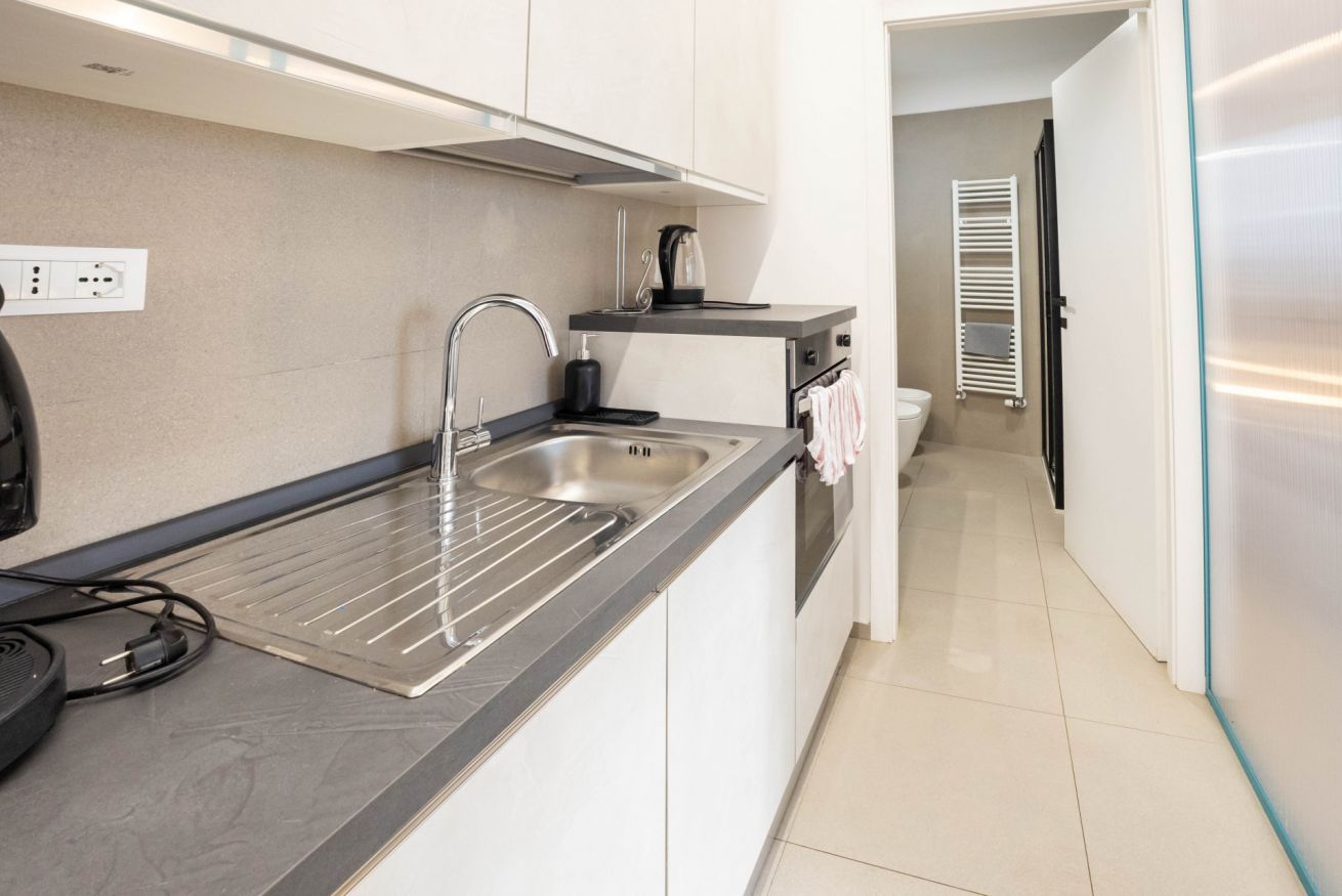 La cucina è completamente attrezzata, dotata dei principali elettrodomestici tra cui forno e lavastoviglie e di un ampio piano di lavoro.