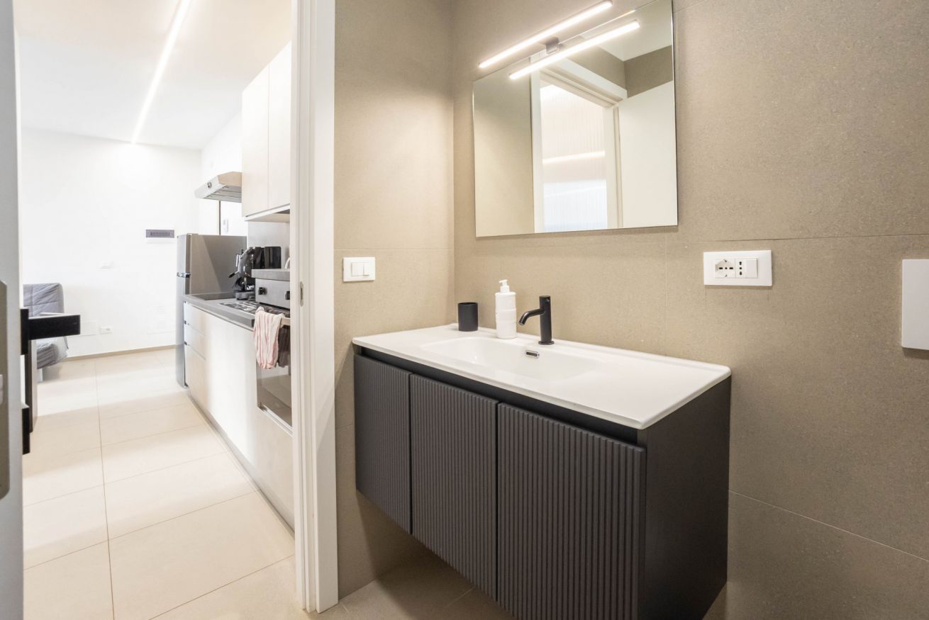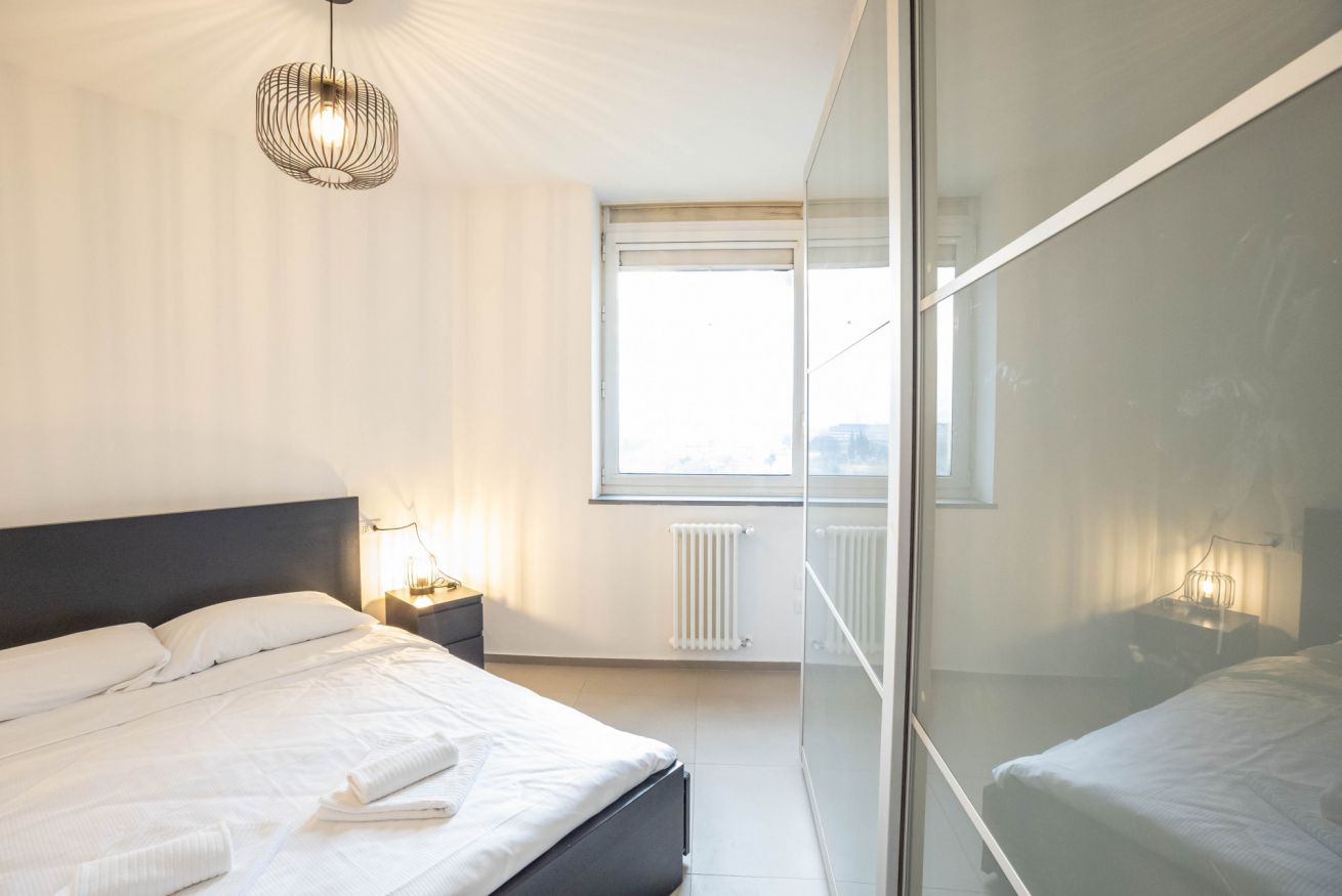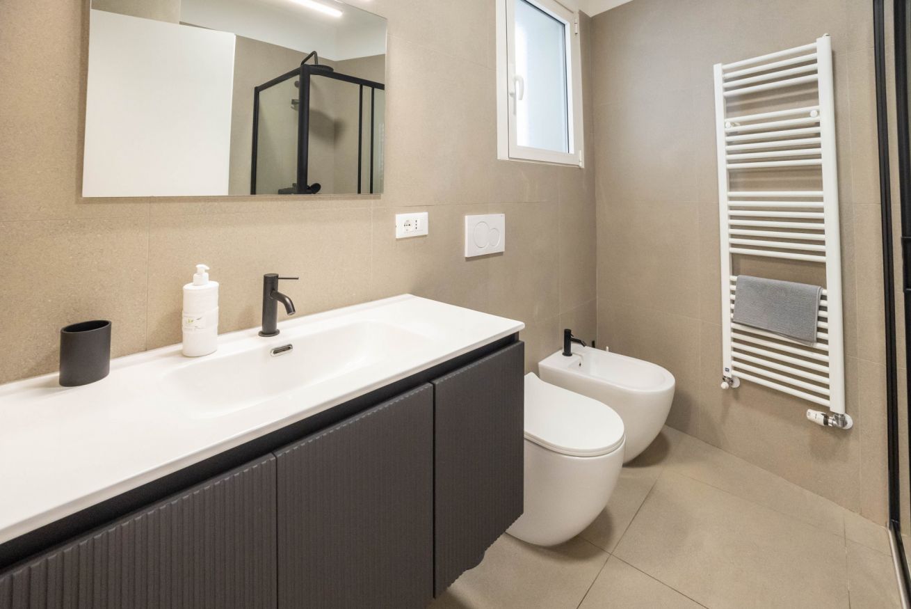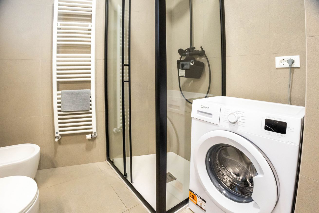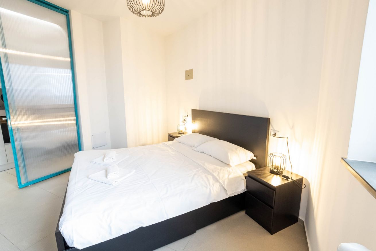 La camera da letto offre un letto matrimoniale un armadio capiente. L’appartamento dispone inoltre di un bagni dotato di vasca, lavandino bidet e lavatrice, con finiture moderne e funzionali.